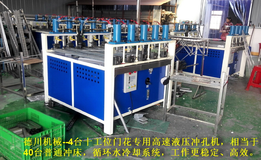 德川機(jī)械--4臺(tái)十工位門花專用高速液壓沖孔機(jī),相當(dāng)于40臺(tái)普通沖床,循環(huán)水冷卻系統(tǒng),工作更穩(wěn)定、高效。...