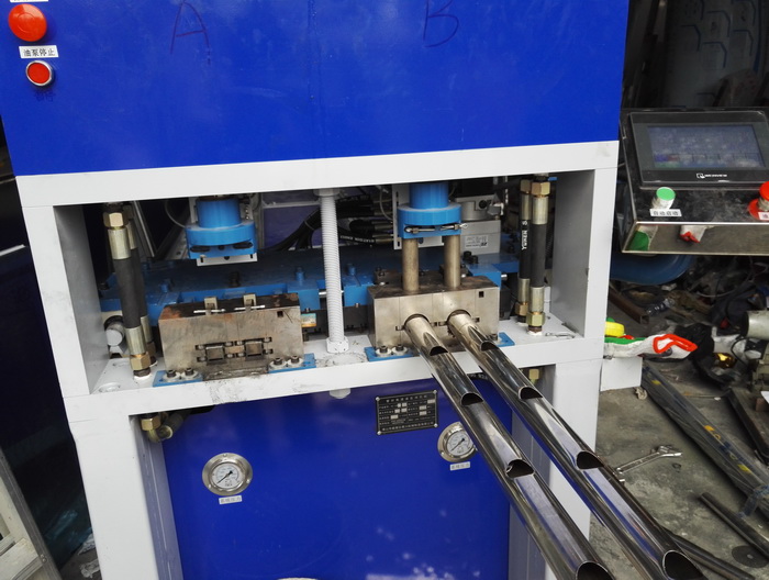 數(shù)控全自動(dòng)樓梯沖孔機(jī),兩工位同時(shí)工作,一次沖四支管,每個(gè)油缸可單獨(dú)控制沖全孔、半孔,大大提高樓梯圓管沖孔效率。